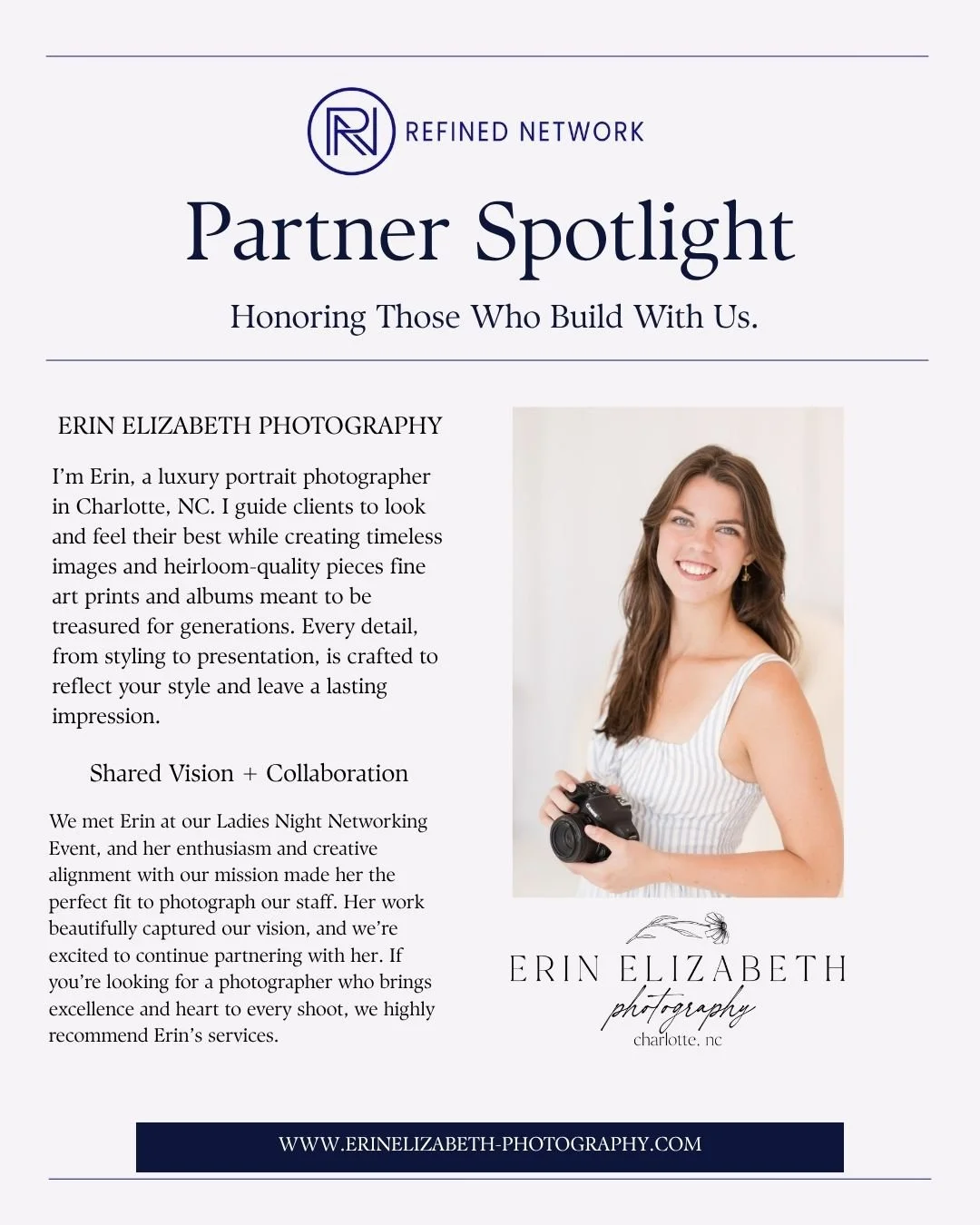 We met Erin at our Ladies Night Networking Event, and her enthusiasm and creative alignment with our mission made her the perfect fit to photograph our staff. Her work beautifully captured our vision, and we’re excited to continue partnering with her. If you’re looking for a photographer who brings excellence and heart to every shoot, we highly recommend Erin’s services.